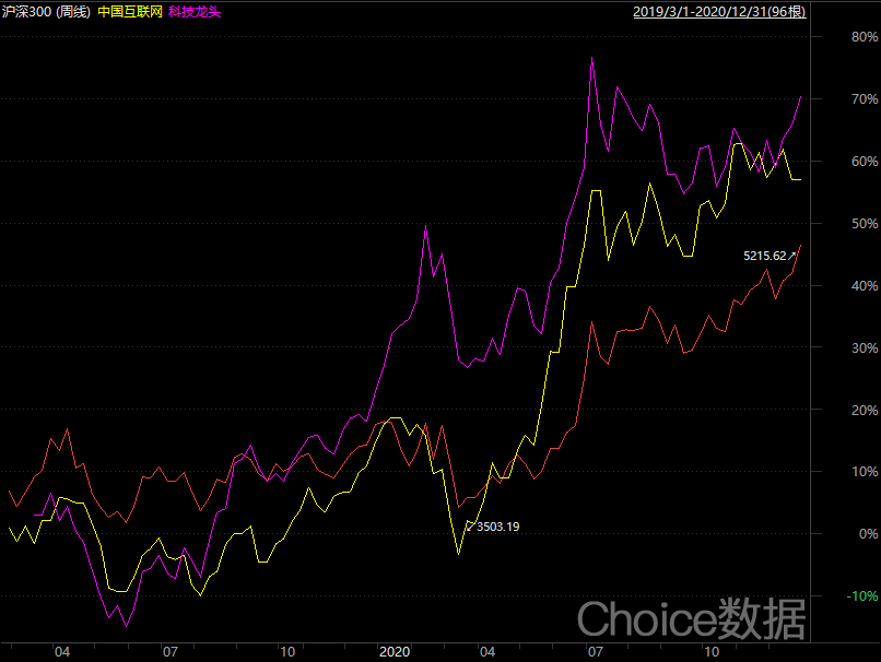 这个指数在过去的三年时间里面,跑赢了下面的两条指数,特别是最下面红色的是沪深300。除了沪深300大盘之外,它也跑赢了另外一条线,就是图里的这条黄色的线,黄色代表的是中国互联网概念指数,也简称中概互联。