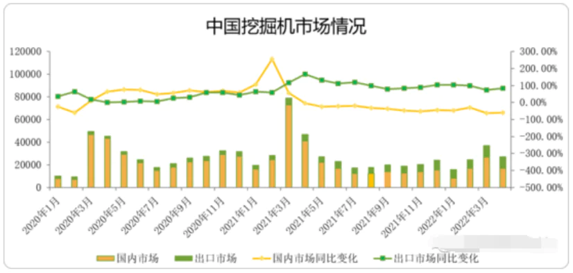 但进入到2021年第二季度之后,工程机械销量开始见顶回落。其中,挖掘机产品月度销量同比出现“八连降”,国内销量则遭遇“九连降”,全年销量呈现出明显的“前高后低”走势。
