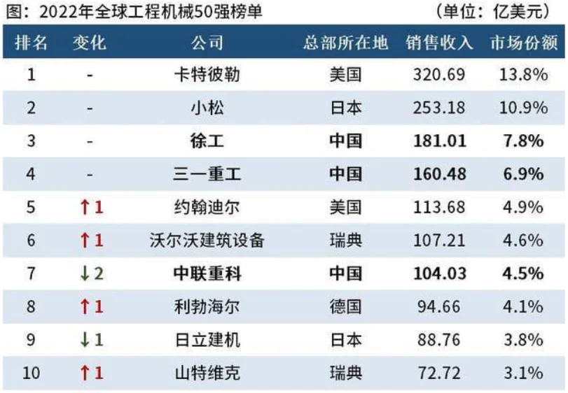 与此同时,国内工程机械行业也是竞争最为激烈的市场之一。根据KHL发布的2022全球工程机械制造商50强排行榜,2021年,共有10家中国企业进入到全球前50名,销售额占比为24%,位居全球第一。在全球排名前十的工程机械企业中,徐工、三一重工和中联重科分列第三名、第四名和第七名。