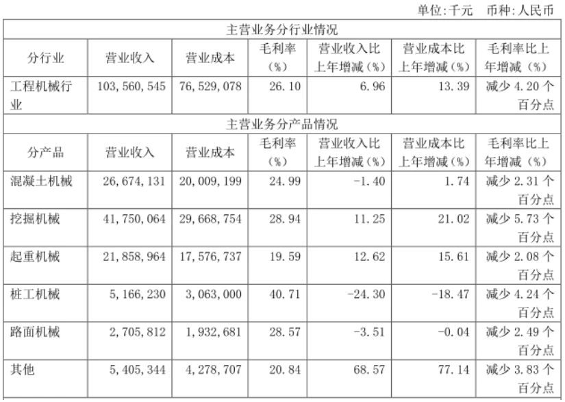 混凝土机械营收为71.1亿元,同比增长24%,混凝土泵车在68个国家市场份额第一;起重机械营收为40.9亿元,同比增长137%,汽车起重机15个国家市场份额第一;桩工机械等其他产品实现营收29.5亿元,同比增长121%,履带起重机12个国家市场份额第一。