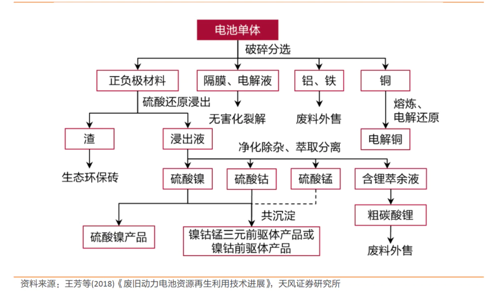 再生利用可高效提取锂、镍、钴、锰等电池金属,实现资源循环。当动力电池容量低于20%时,其性能与容量都已无法满足商业应用的要求,此时应通过再生利用工艺对废旧动力电池中的锂、镍、钴、锰等电池金属进行提取回收,实现资源循环。