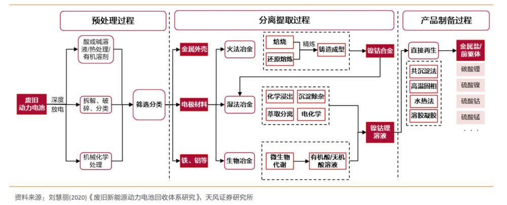 图 :废旧动力电池再生利用的技术路线及再生过程