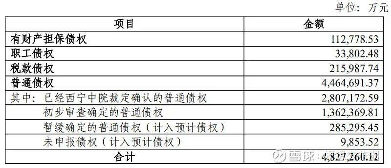 根据盐湖股份公司债权申报与审查情况、管理人对职工债权的调查情况以及重整受理日公司财务账簿的记录等,盐湖股份公司的负债汇总如下表所示: