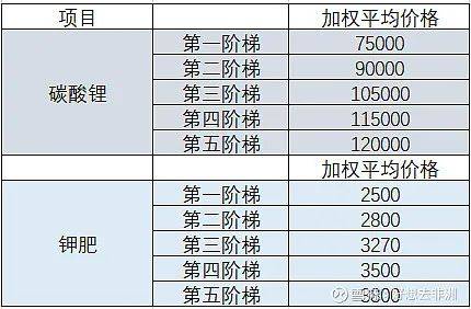 目前盐湖股份新签钾肥合同订单价格为3270元/吨,3270价格目前拿不到货,市场报价局部已经到4650元/吨,综上,我们对钾肥价格加权平均设定2500-3800元,碳酸锂取值为75000-120000元/吨。