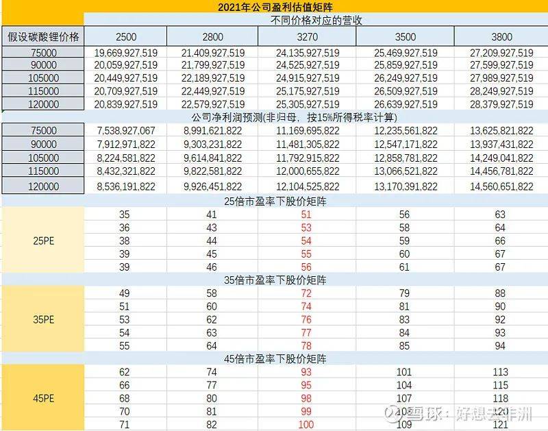 根据各项业务收入、成本,我们根据以往的报表炮制2021年损益表,按15%企业所得税,再根据业绩推导出盐湖股份的估值矩阵,以及不同估值下推导出公司股价,演算过程就不细讲了,如果按归母利润,会少一些,我这份估值是按净利润估值,追求模糊正确。