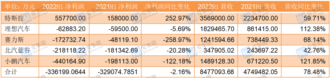 那么,持续承压动力电池成本上涨情况下,半年过去了,新能源汽车企业的赚钱能力如何?就此,笔者统计了8月28日前公开上半年财报的新能源汽车主机厂业绩,本次挑选了特斯拉、理想汽车、赛力斯、北汽蓝谷、小鹏汽车为分析对象。