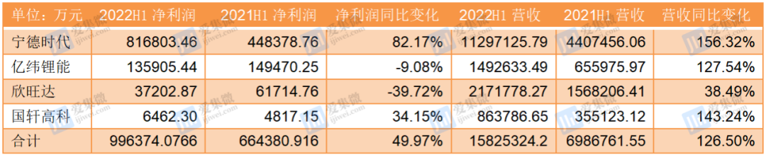 从营收看,4家企业均较上年同期实现了可观的营收增速,除欣旺达仅增长38.49%外,其他3家企业均同比增长超过127%,整体同比增长126.5%。不过净利润的增速则不理想,仅宁德时代和国轩高科实现同比增长,而亿纬锂能和欣旺达出现了净利润下滑的情况。