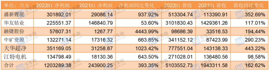 上游资源镍钴锂方面,本次挑选盛新锂能、华友钴业、融捷股份、中矿资源、天华超净、江特电机作为统计对象,这6家企业上半年合计营收510.35亿元,同比增长162.62%;不过净利润的增速更高,合计净利润为120.33亿元,同比增长393.35%。具体看,除华友钴业净利润没有翻倍外,其他企业的净利润均同比增长6倍以上,其中融捷股份净利润同比增长44.44倍。