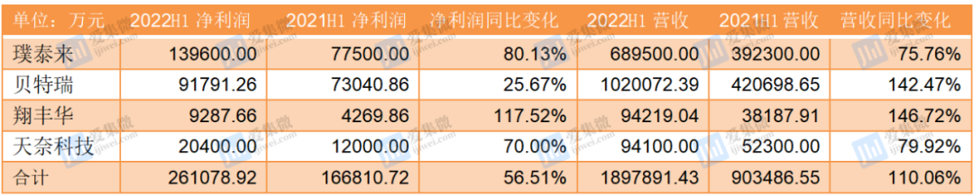 相比正极材料企业业绩大涨,负极材料企业的业绩增速相对要缓和些,本次统计的璞泰来、贝特瑞、翔丰华、天奈科技4家企业中,合计营收为189.79亿元,同比增长110.06%;合计净利润为26.11亿元,同比增长56.51%。虽然负极材料企业的业绩也在增长,但显然出现净利润增速不及营收增速快的情况,其中,负极材料头部企业之一的贝特瑞,上半年其负极材料营收同比增超165%,但毛利率仅为23.54%,同比下滑11.15个百分点,主要受上游原材料价格上涨、石墨化加工产能紧张、委外加工成本上升等因素影响。