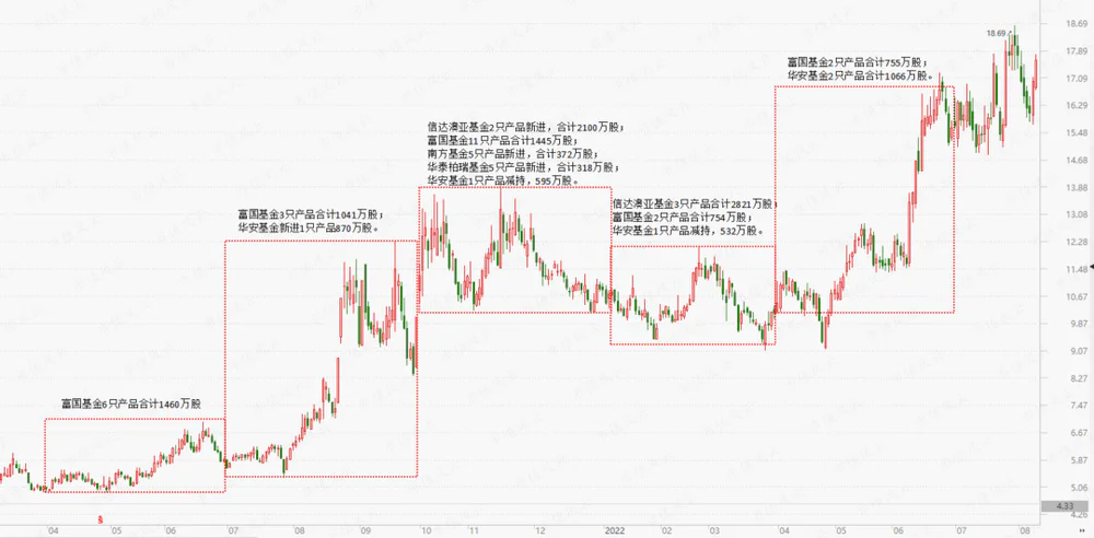四方达股价在低位时,2021年二季度,富国基金6只产品率先买入,随后,几个季度其他公募基金才开始跟随买入。