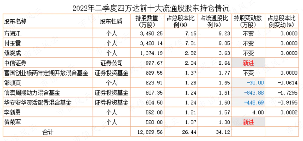 2022年二季度四方达前十大流通股股东中有三位减持,合计1323万股,同时有两位新进,中信证券、黄荥军,合计1517万股。