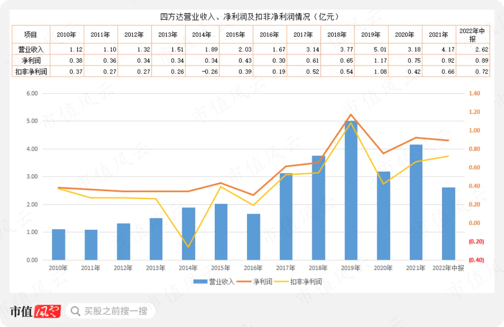 从净利润看,四方达自上市以来净利润没有出现亏损,但在2016年之前,盈利不算高,每年三四千万的利润规模,大幅增长是在2017年、2019年,今年中报净利润达0.86亿元,接近2021年全年的利润规模。