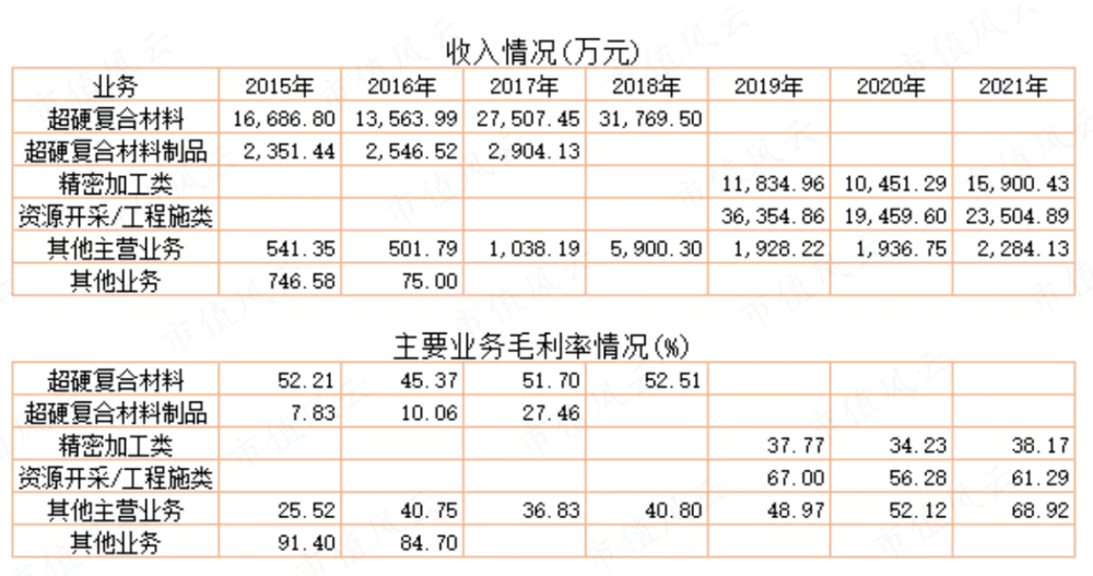 资源开采/工程类钻头(超硬复合材料)收入规模较大但不稳定,2019年至2021年,分别为3.6亿元、1.9亿元、2.35亿元,毛利率比较高,基本在50%以上;