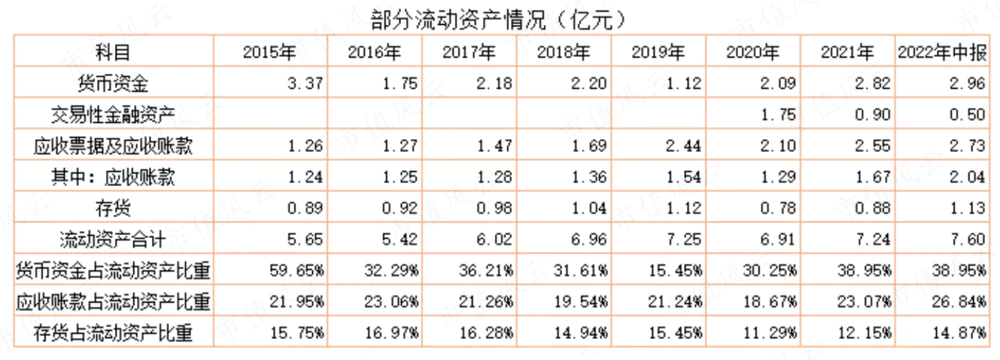 流动资产中主要是货币资金和应收账款,其中货币资金基本上保持在2亿元以上,占流动资产的3至4成;应收账款占流动资产的比重保持在20%至25%。