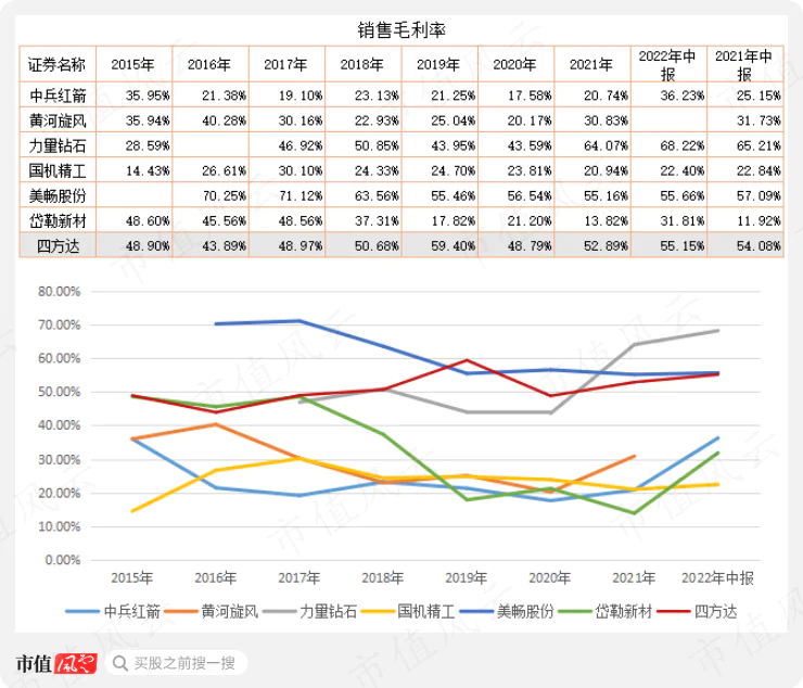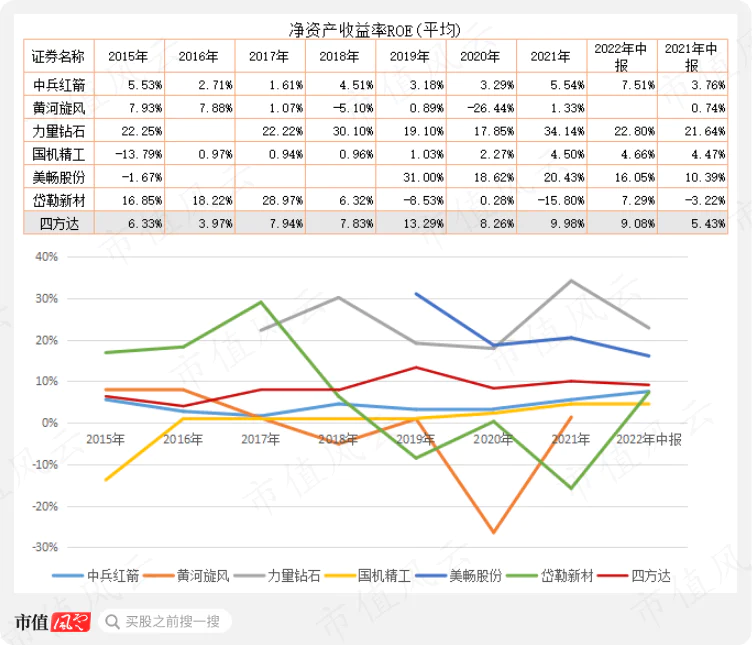 再看净利率,也是有个非常明显的分层,力量钻石、美畅股份高于其他5家公司,四方达排第三,并且也是呈现明显的上升趋势,2022年中报为33%,比去年同期高出8个百分点。