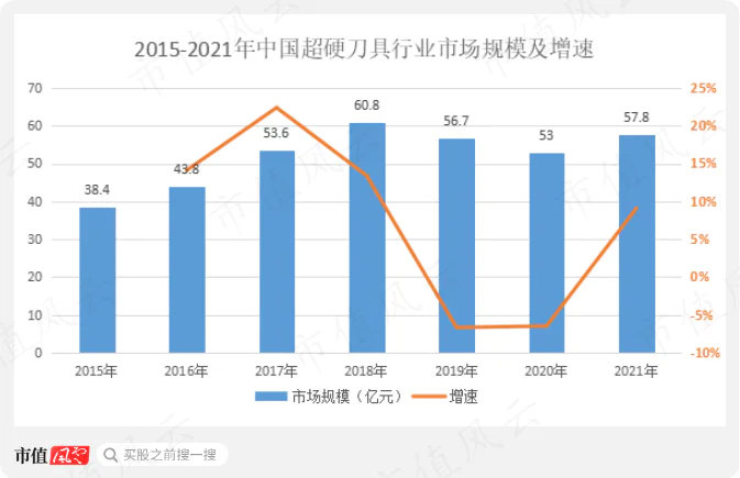 由于是2B的市场,且销售规模与受下游的油气开发行业影响很大,该公司上市后很长时间里,营收增长并不大,直到最近两年精密加工国产化替代进程加快以及光伏装机量大幅增长,进而带动该公司刀具产品、金刚石材料需求,公司才重回投资者视野。