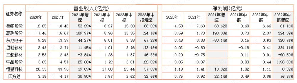 从业绩来看,在2022年中报,上述7家的营业收入均保持增长,其中有6家公司的净利润增长,而增速超过100%有4家。