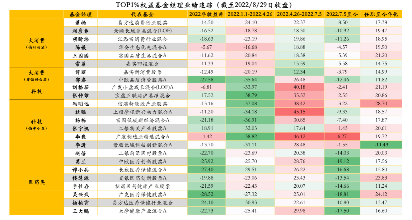 总体来看,医药是三大赛道之中业绩差异最小的方向。在1-4月和7月之后的下跌,以及4月-7月的反弹中,不同公司、不同基金经理管理的医药基金的业绩整体保持了同涨同跌的节奏,相互之间的业绩差异非常小。