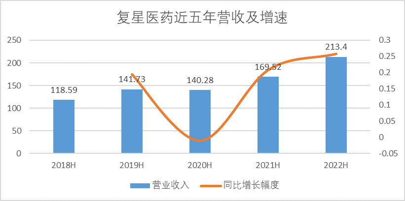 复星医药半年营收无论是增长幅度还是可持续性都很扎实,2022年半年报实现营收213.4亿元,同比增速达到了25.88%。