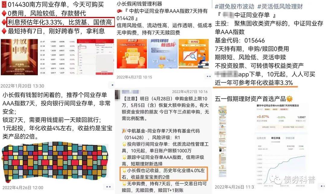 2.年初流动性淤积,货基收益率一再下滑,同业存单收益率其实也在下滑。但是因为货基以摊余成本法估值,市场判断其可投资性主要看“7天年化收益率”这个指标;而同业存单虽然在市场环境上和货基面临着一模一样的处境,但是由于其采用市值法估值,所以一段时间内净值涨速较快,所以当时营销层面普遍采用成立以来年化回报“3.3%以上”甚至“4%左右”来给投资人建立同业存单基金的收益预期。