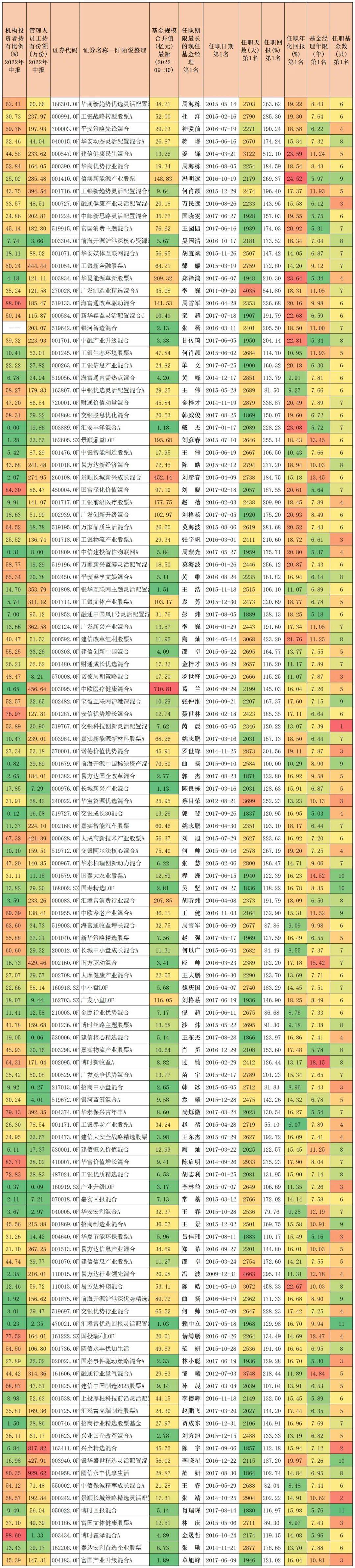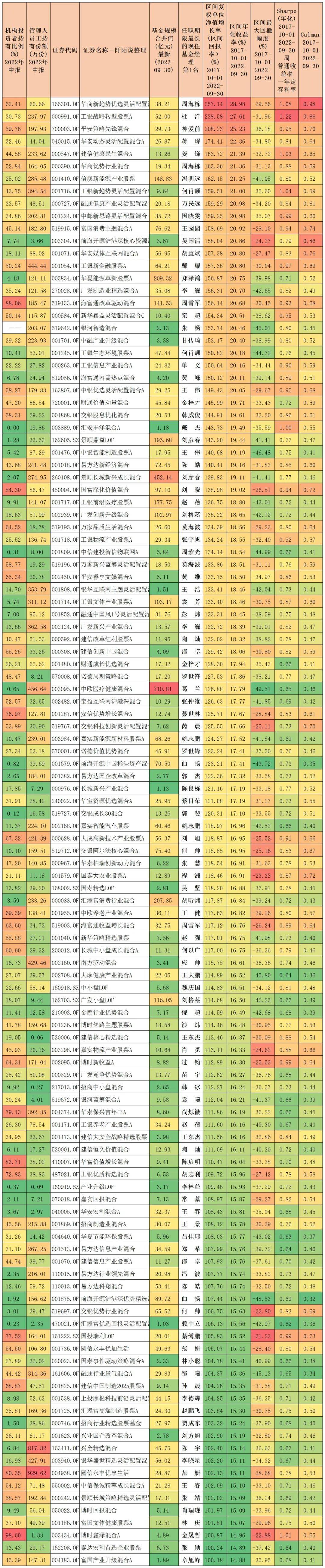 118只基金涉及99位基金经理,按照近五年区间收益率由大到小排序如下:排名靠前的有周海栋、杜洋、神爱前等。表格中还有机构占比、基金公司员工持有份额、区间年化回报、区间最大回撤、区间夏普比率、区间卡玛比率等信息。表格中信息量还是比较大的,能做到五年翻倍的基金经理其实都是比较优秀的,别看不起哦。