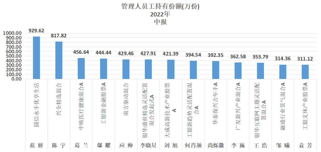 从基金员工持有份额来看,将持有超过300万份的全部罗列如下,其中范妍、陈宇被员工持有929.62万份和817.82万份,是99位基金经理中被员工持有最多的两位。