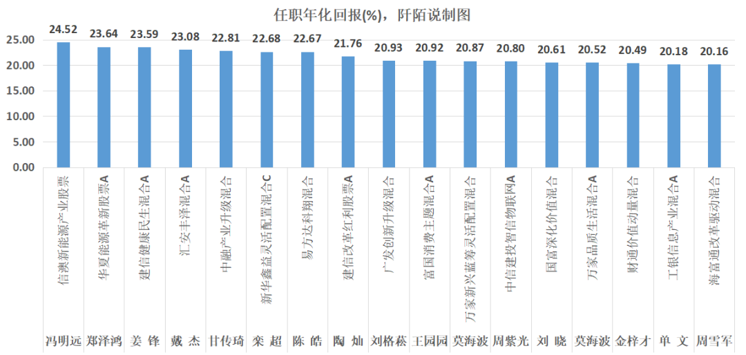 将上表任职年化回报大于20%的单独罗列如下,涉及到的基金经理有冯明远、郑泽鸿、姜锋、戴杰、甘传琦、栾超、陈皓、陶灿、刘格菘、王园园、莫海波、周紫光、刘晓、金梓才、单文、周雪军。