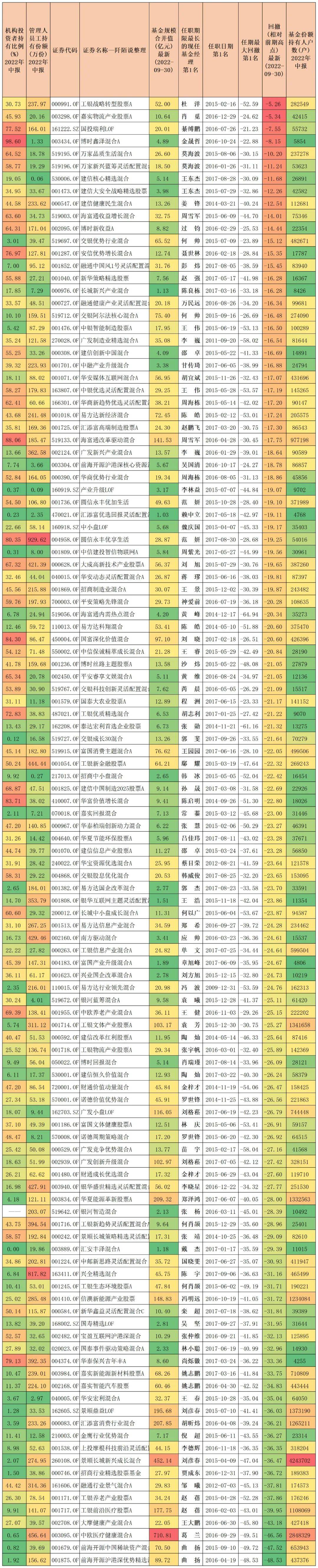 118只基金按照目前相对前期高点的回撤排序如下,其中杜洋、肖觅、綦缚鹏等回撤较小,榜单底部的基金经理就是读者想知道的“最近比较拉胯的基金经理”。