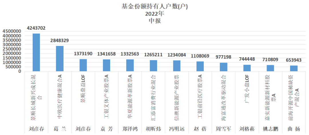 上表还披露了持有人户数的信息,目前相对比较热门的12只基金展示如下,刘彦春被424.37万用户持有,葛兰被284.83万用户持有……如果想挖掘“冷门”基金则应该避之。
