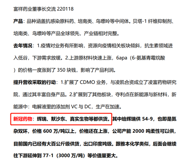 在这份流传甚广的纪要里,最核心的内容就是公司已给辉瑞、默沙东、以及真实生物等厂商提供新冠中间体。而事实上,在1月29日给深交所的回复中,公司写明并未给上述三家供货。如此一来,事情就很清晰,那就是有人故意伪造出假纪要方便出货。