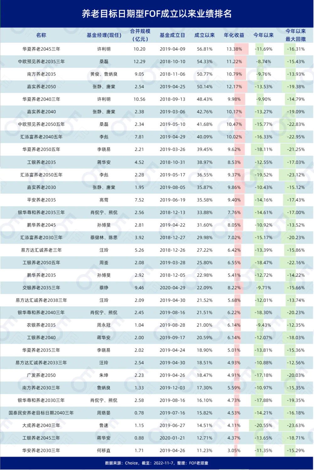 这与我们养老投资的初衷非常吻合,在我们年轻时,风险承受能力比较高,可以提高权益比例的仓位;而到了接近退休的年龄,需要足够稳健的资产来保障退休生活,所以资产的风险暴露越低越好。时至今日,年化收益超过10%的养老目标日期型FOF共有7只。