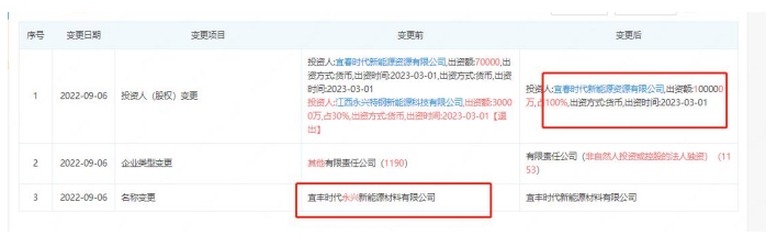 华夏能源网注意到,龙蟠科技实际上就是永兴材料的“接盘侠”。龙蟠科技公告中的宜丰时代,就是由宜丰时代永兴新能源材料有限公司(以下简称“宜丰时代永兴”)变更而来,后者是当时永兴材料和宜春时代合资成立的公司。