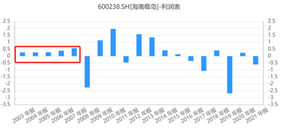 从过往来看,海南椰岛至少风光过。在2007年以前,海南椰岛基本每年都能净赚几千万。不算多,但稳定。