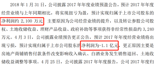 2018年1月末,海南椰岛披露2017年度业绩预告,称公司扭亏为盈,预计净赚2100万。按照这个走向,海南椰岛即可免于实施退市风险。然而俩月后,海南椰岛即披露更正公告,称2017年度归母净利润预计将亏损1.1亿。