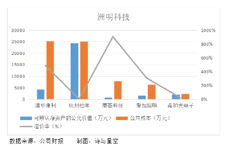 2017年洲明科技的商誉比上一年增长了3.43亿,增幅约6倍,主要是因为并购清华康利、蔷薇科技、杭州柏年等5家公司,其中并购清华康利和蔷薇科技分别产生约2.1亿和0.72亿商誉,溢价率高达488%和904%。