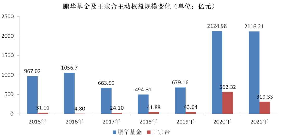 随着后来以袁航、王海青、蒋鑫、孟昊为代表的中生代与新生代基金经理初露峥嵘,梁浩、伍旋、陈璇淼等核心基金经理渐入佳境,特别是2020年鹏华基金打造出王宗合这一“国民基金经理”形象后,公司主动权益规模迎来爆发式增长,从2019年的679.16亿元猛增至2020年的2124.98亿元,王宗合个人的管理规模更是占到当年鹏华基金主动权益规模的1/4。