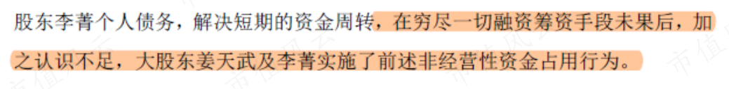 2021年-2022年3月期间,实控人姜天武、及其一致行动人李菁、李军、李建伟、张爱纯,累计非经营性占用上市公司资金1.34亿元。