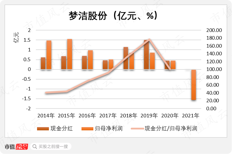 直到2021年归母净利润亏损1.56亿元,梦洁股份才停止分红。