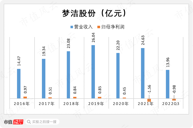 2022年前三季度,梦洁股份亏损继续,实现营业收入13.96亿元,归母净利润-0.98亿元。