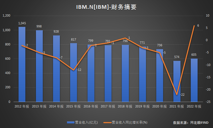 尽管只有6%的增幅,IBM 2022年度经营业绩仍被市场解读为利好。因为在过去的十年里,IBM营收规模一路缩水,仅在2018年取得了0.57%的微弱增长。尤其是2021年,IBM营收降幅高达22%,营收规模跌至574亿美元。
