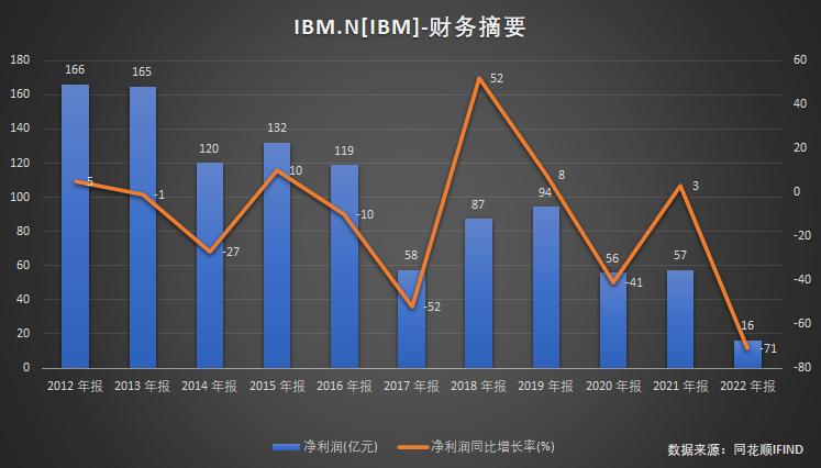 2022年第四季度,IBM实现营收167亿美元,与上年同期的166.95亿美元相比基本持平,略高于市场预期的163.8亿美元;实现净利润27.11亿美元,同比增长16.25%。