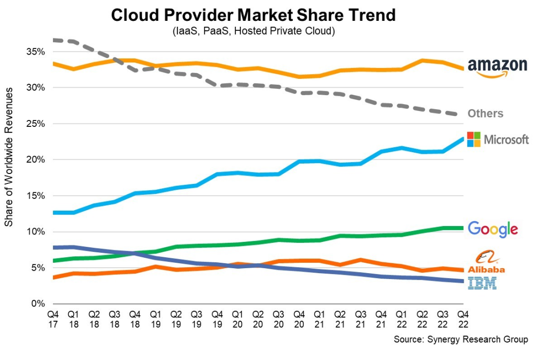 事实证明,红帽公司的开源平台优势对IBM发展混合云业务确有帮助,却并未改变IBM云计算业务的陨落轨迹。Synergy Research Group的数据显示,自2018年以来,IBM云业务市场份额一路下滑。2022年,IBM在全球云计算市场中的份额仅为4%,也是云计算前五名厂家唯一下滑的一家。