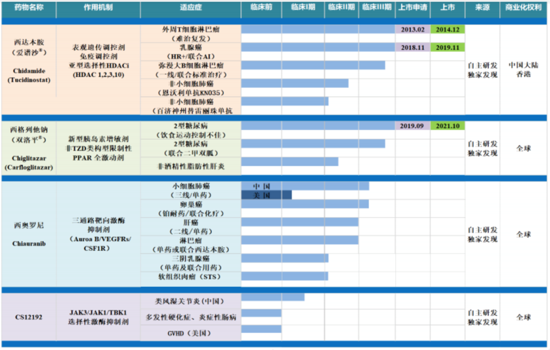 微芯生物基于自主研发的核心平台,成功发现并开发了包括西达本胺、西格列他钠。除此之外,还有西奥罗尼和CS12192等一系列新分子实体且作用机制新颖的原创新药。截至目前,公司研发管线中还有近20个项目处于早期开发至临床前阶段,适应症涉及恶性肿瘤、糖尿病等代谢性疾病、自身免疫性疾病、抗病毒领域、中枢神经系统等领域的原创新药研发。