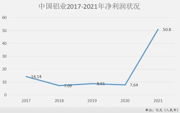 同期,中国铝业的盈利表现亦呈一定波动性,上述期内净利润分别为14.14亿元、7.09亿元、8.61亿元、7.64亿元、50.8亿元。其中,2021年公司净利润同比增逾5倍。