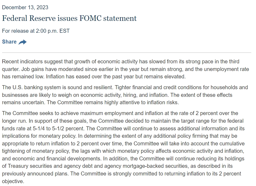- 北京时间周四凌晨3点,美联储联邦公开市场委员会发布2023年的最后一份利率决议,与市场预期一致,联邦基金利率区间继续维持在5.25%-5.50%,自今年7月底加息至这个位置后维持不变,不过决议措辞和经济预期则充满了令股民欣喜的变化。