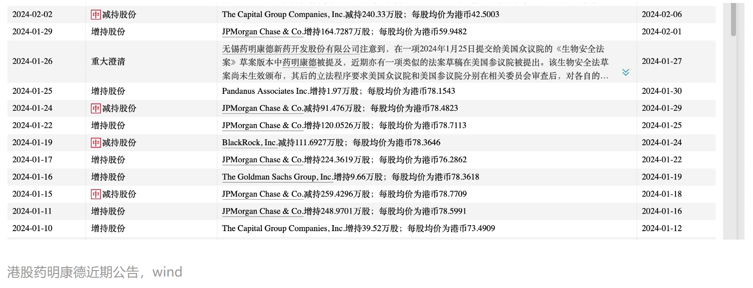 - 值得注意的是,就在药明康德AH股暴跌之前的1月中旬,“药明系”上市公司分别被贝莱德、摩根大通、资本集团减持,交易价格比大跌后的股价要高出30%至50%。而在1月10日与1月11日,资本集团和摩根大通还刚刚增持过药明康德,增减持之间间隔如此短暂,且减持时间准确地卡在了股价暴跌之前。