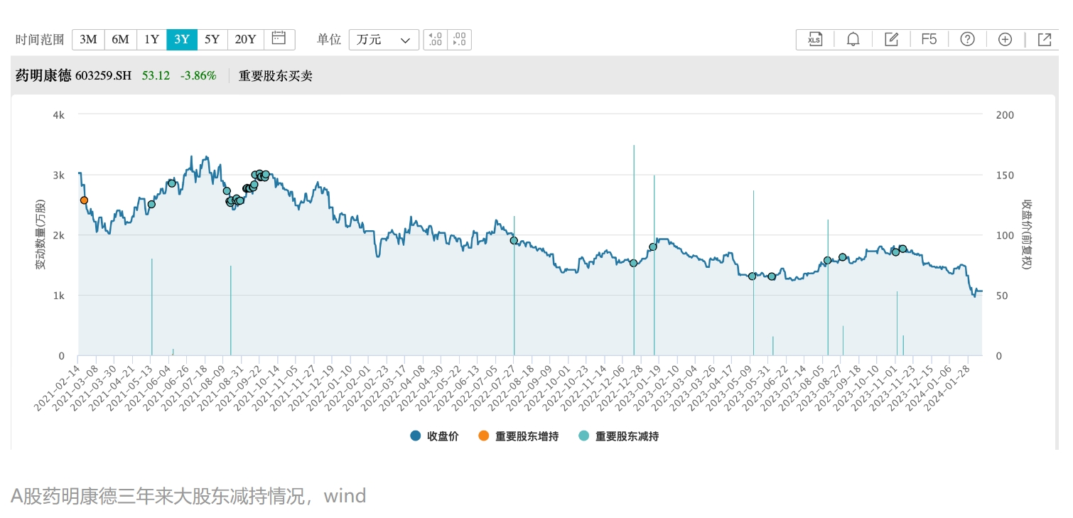 - 据wind数据,自2021年以来,A股药明康德共经历51次大股东减持,仅有的7次大股东增持均发生在2021年初,且全部为分红转送和股份激励增持,增持数量在巨大的减持额度面前不值一提。仅在2023年,药明康德就发生了8次大股东减持,合计减持超16070万股,对应市值超百亿人民币。1月29日,药明康德A股转融券融出近63万股,这与1月25日2万股的融出规模相比,直接飙涨超30倍。