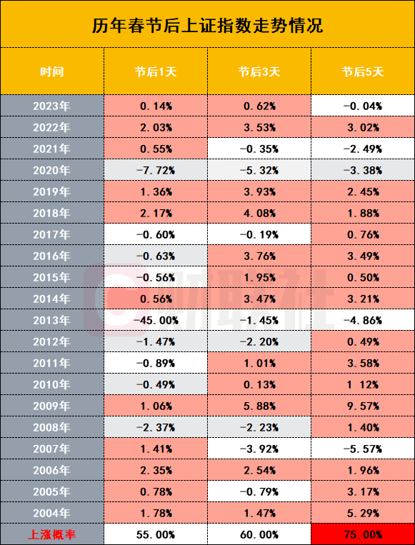 - 从历史数据不难发现,A股春节后“开门红”概率较高,又因当前大盘整体处于低位区域,叠加春节期间中国资产高昂的表现,A股春节后延续节前的涨势值得期待。