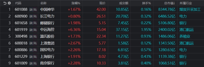 - 今日(5月27日),多只权重股再度发威,截至收盘,千亿市值股中,中国神华、长江电力、邮储银行、中远海控、温氏股份、上港集团、国投电力、上海银行、南京银行续刷年内新高。其中,中远海控今日涨幅居前,全天收涨近6.4%,且盘中一度涨超7%,成交额近37.2亿元,仅次于今日成交额最高的贵州茅台(42亿元)。